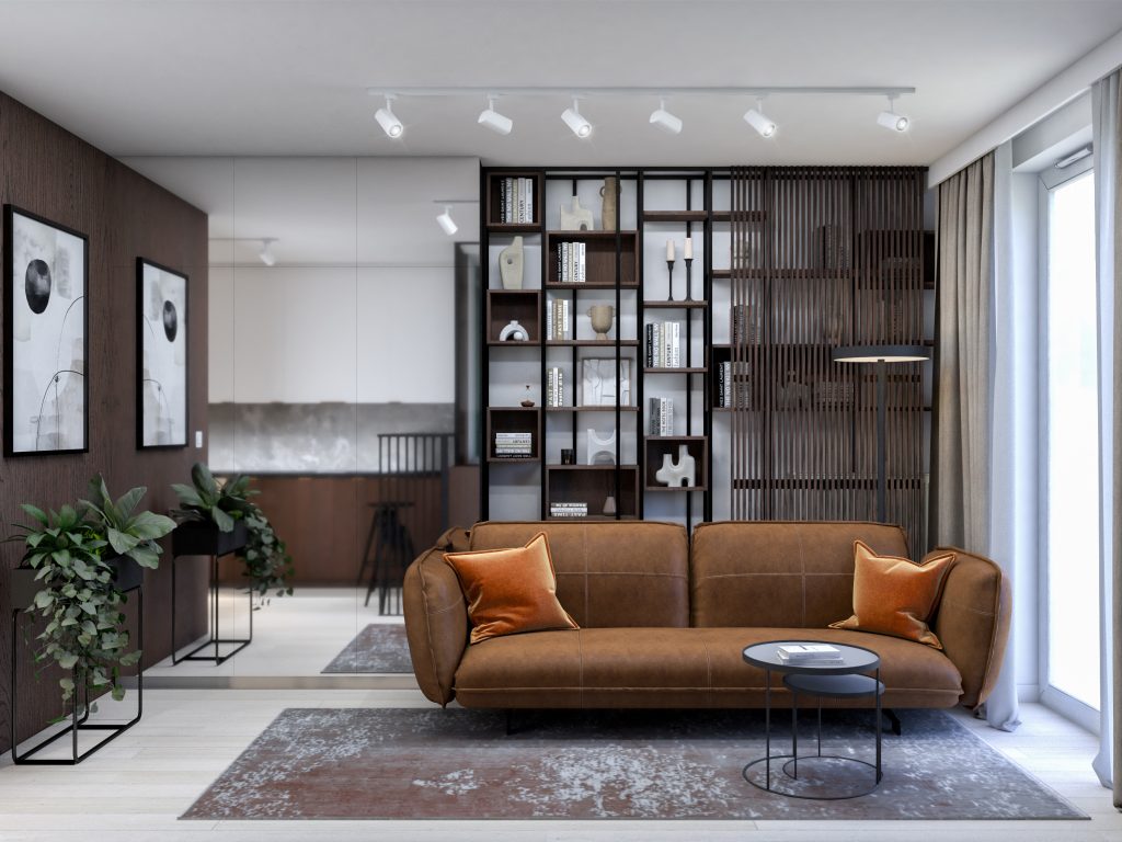 Projekt wnętrz mikro apartamentu na wynajem. Stan deweloperski. 29 m2. Styl urban chic z akcentami loft.